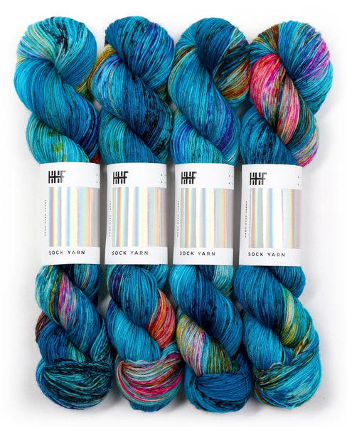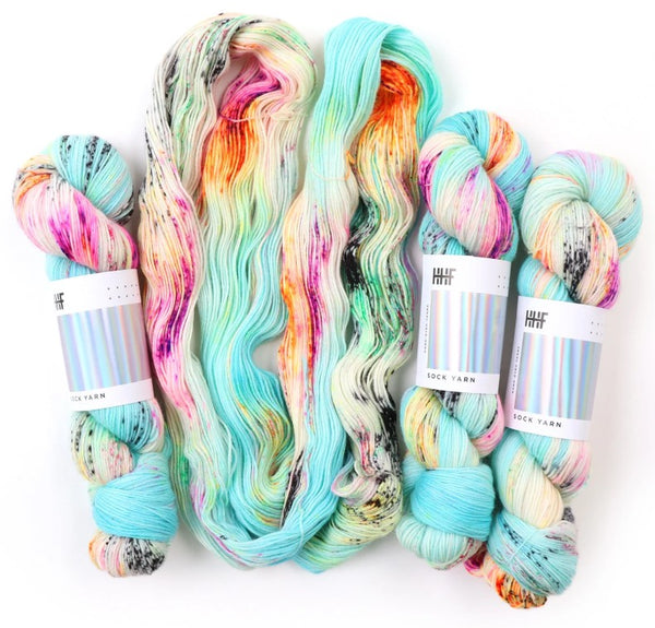 Fingering weight yarn, 90% Merino wool, 10% nylon, superwash. 21.5 micron Merino wool, softly spun, non-scratchy yarn. Great for socks, blankets, and all your most loved projects that need a great pop of color!